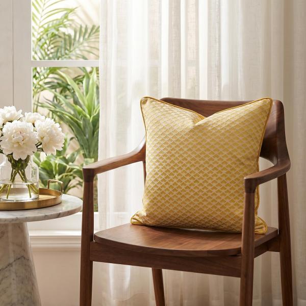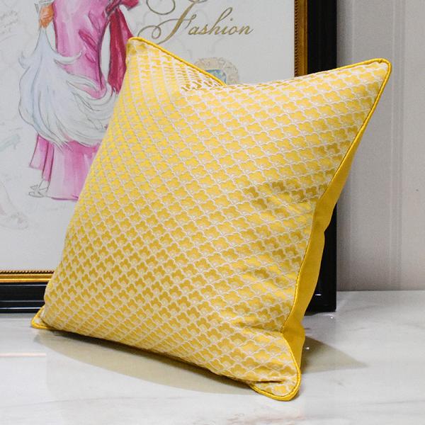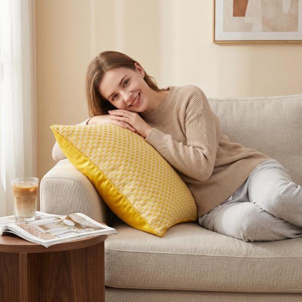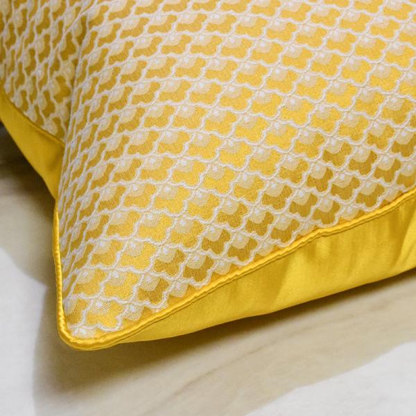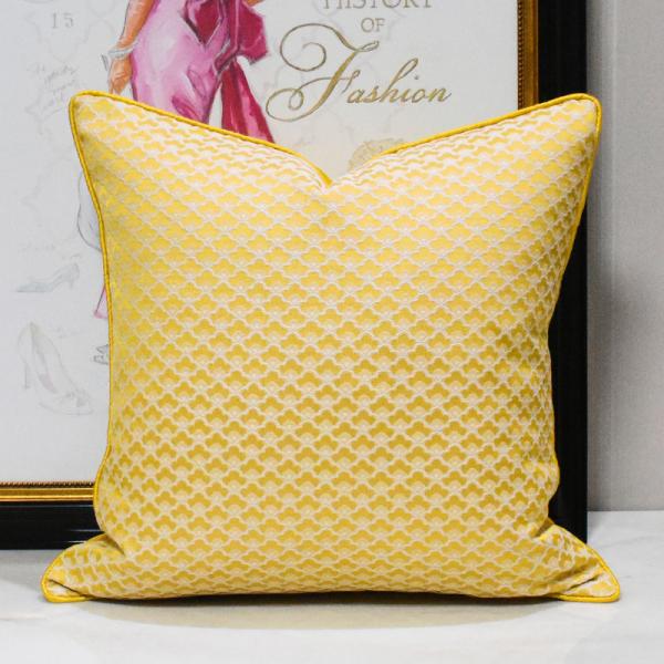 Bright yellow fish-scale jacquard pillowcase, made of high-density jacquard fabric with a fresh off-white background pattern, features a same-color rolled edge design and a bright yellow satin back. It can be used in two ways and is suitable for various home styles such as Nordic, French and modern, easily brightening up the space atmosphere.