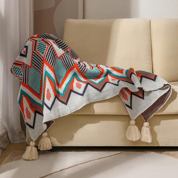 波西米亚风锯齿纹针织流苏盖毯 多色编织沙发搭毯