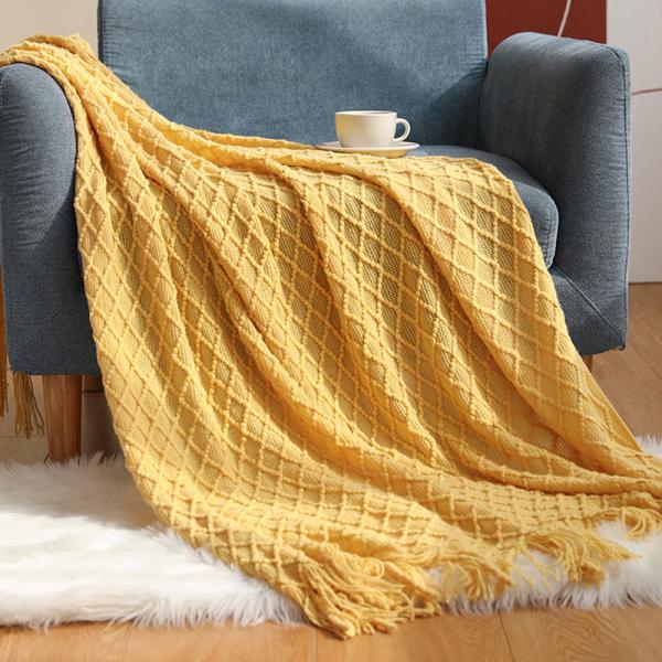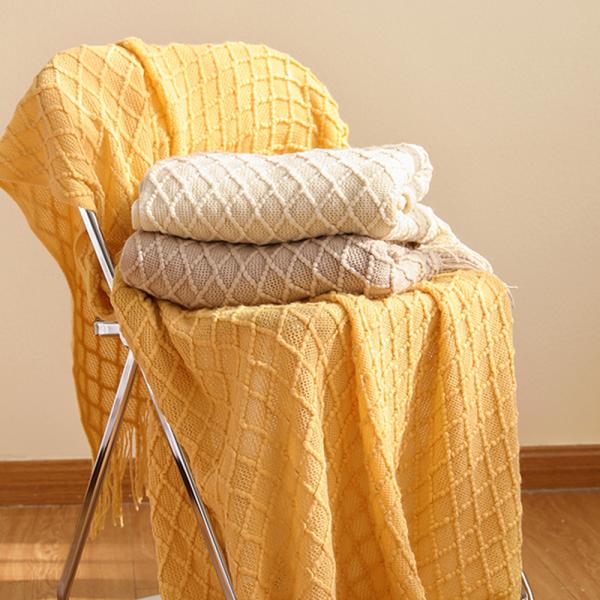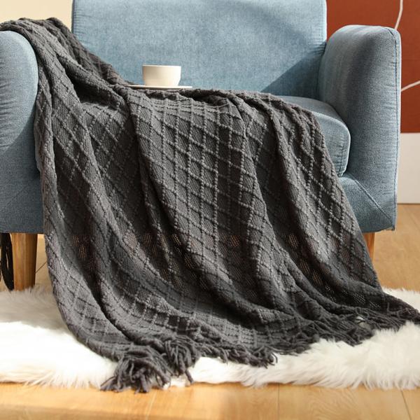菱形花针织流苏休闲毯,酒店民宿通用床尾装饰毯,可兼作沙发盖毯、空调毯,多色可选,一毯多用,耐用易打理。