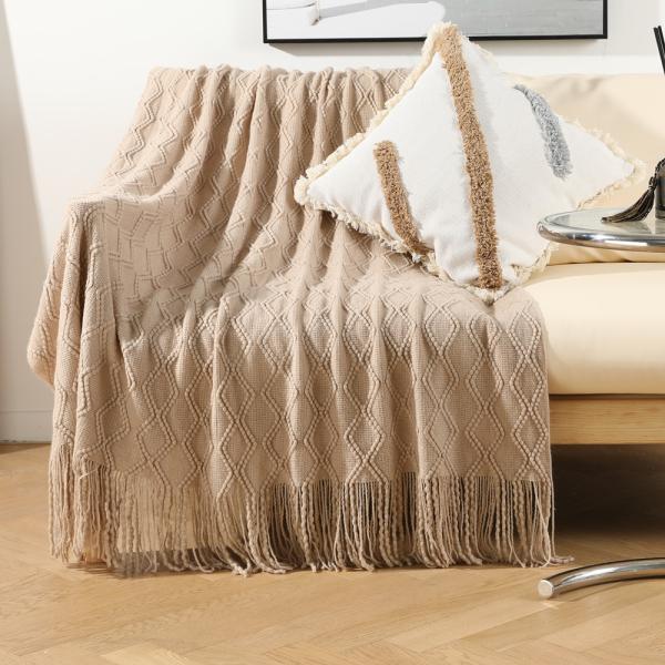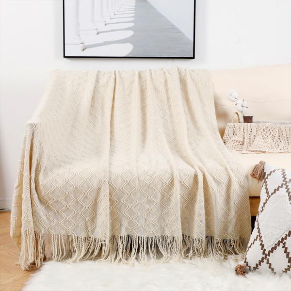 双菱形花针织休闲毯,含流苏,530g/830g 可选。可作酒店民宿床尾装饰毯、沙发盖毯,一毯多用,耐用易打理,适配商用与家用场景。