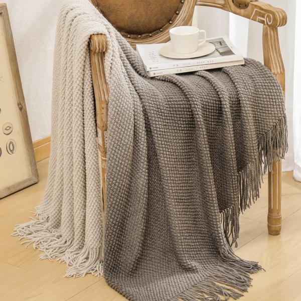 渐变豆豆针织流苏休闲毯,多色可选,可作酒店民宿床尾装饰毯、沙发盖毯,软糯亲肤,四季通用,耐用易打理。