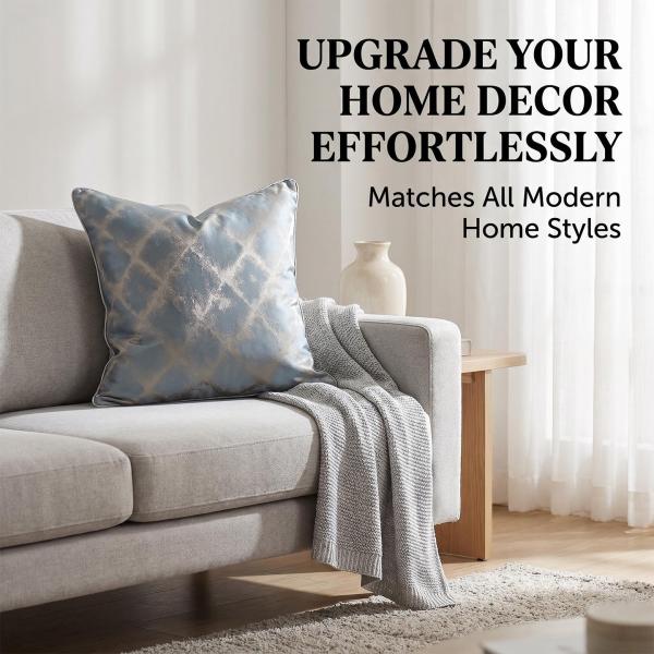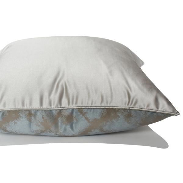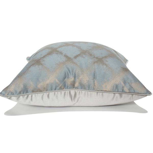 治愈浅雾霾蓝鎏金晕染菱格抱枕,艺术做旧斑驳格纹肌理,高密丝滑缎面光泽面料,同色系精致包边